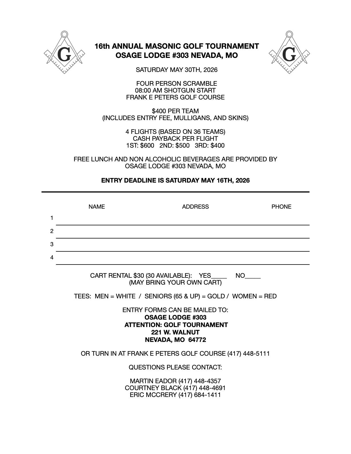 Osage Lodge No. 303 16th Annual Golf Tournament. All proceeds go to the Create a Partnership Program sponsored by Osage Lodge No. 303 and the Masonic Home of Missouri. This charity program helps with needs of all children in the Vernon County area.